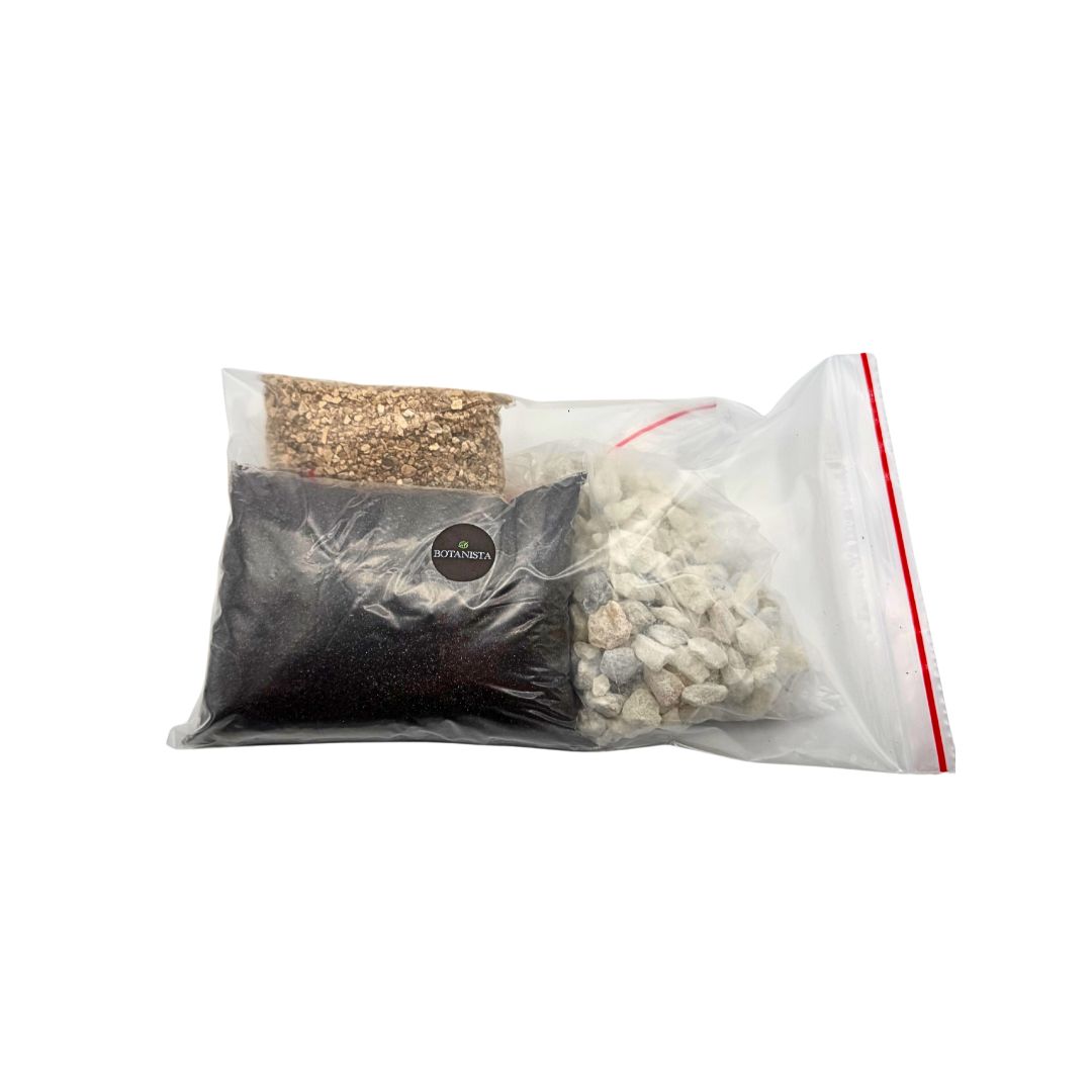 This Substrate Kit takes the guesswork out of creating your own terrarium at home. If you have your own glassware at home and would like to make your own terrarium, we have created this substrate kit for you. No more wondering where to start, this kit contains base pebbles for your drainage substrate, vermiculite for your absorbent substrate layer and our own hand-blended premium terrarium soil mix.